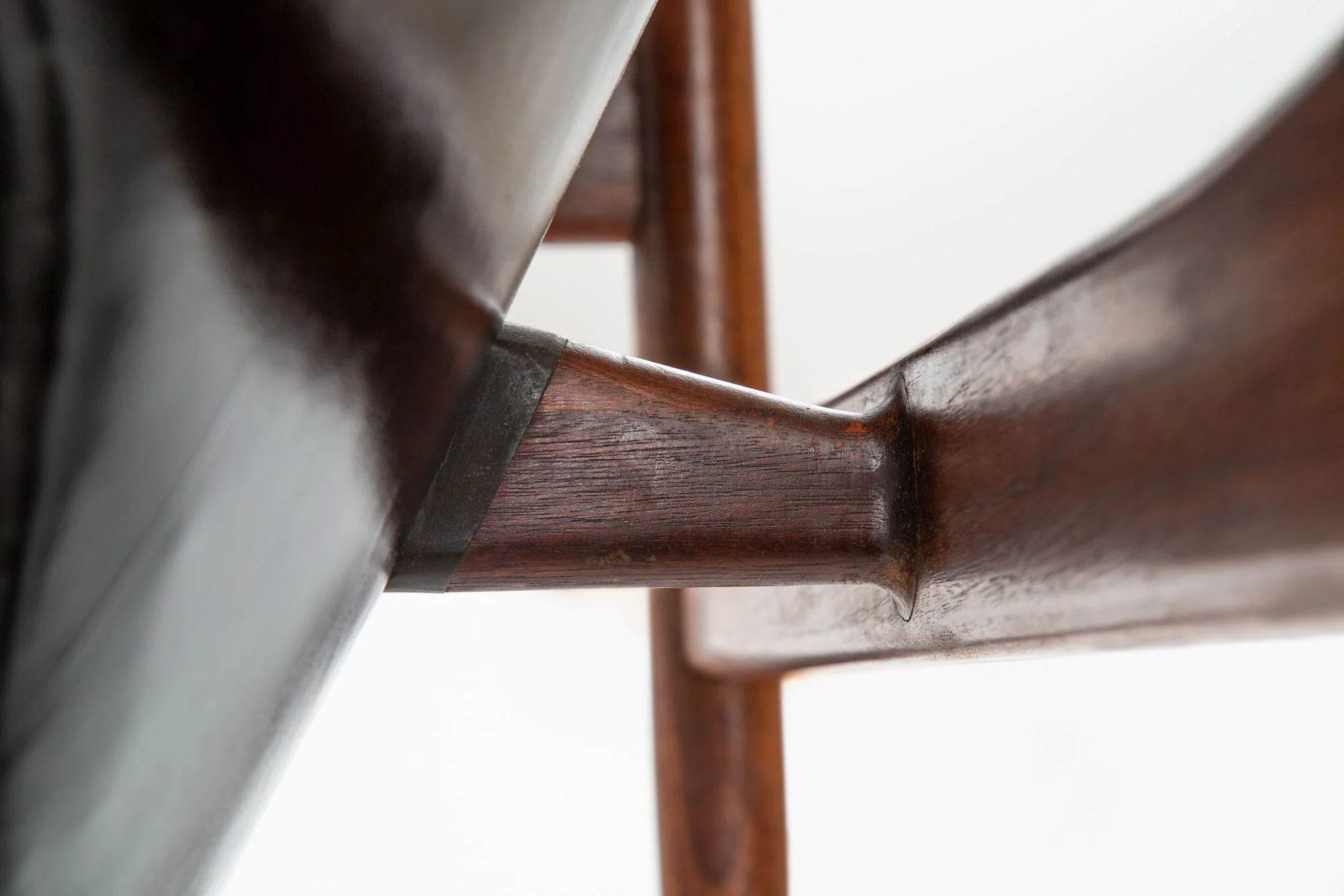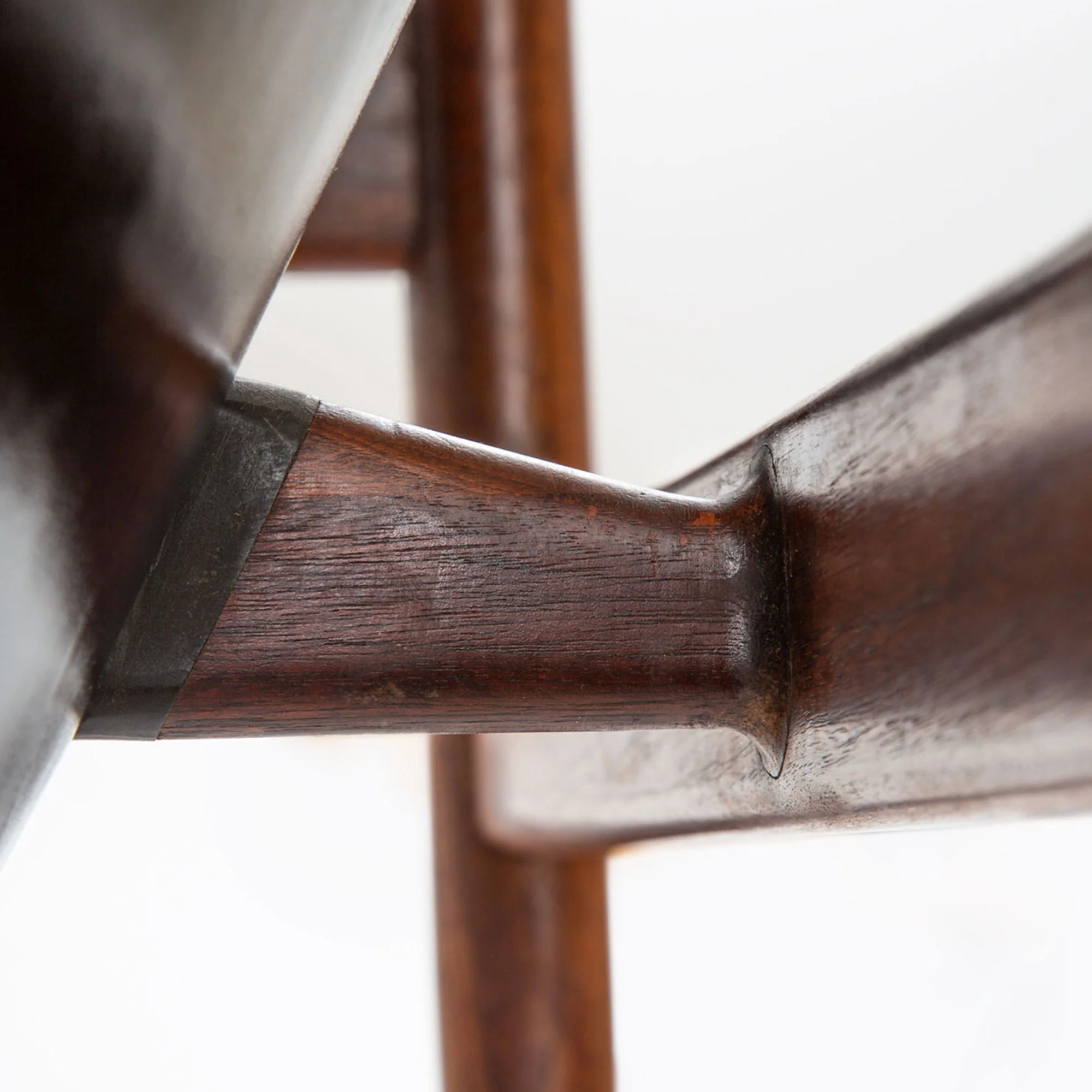 The arms of this chair look the same as any other Niels Vodder Chieftain chair, but they don’t pass the magnet test suggesting that they are made of aluminum. Close inspection reveals that they are indeed a cast metal. This assertion is supported by an excerpt in 1952 Dansk Kunsthaandværk that says the arm plates are made of aluminum. It is just one of many short lived attributes that make this chair particularly special in the context of the chair’s evolution.